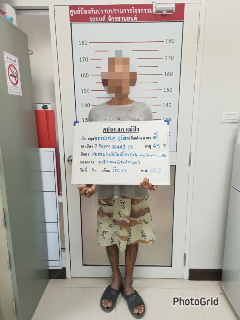 4.พฤติการณ์ เมื่อวันที่ 13 มี.ค. 2568 ชุด ศปจร.สภ.แม่ปิง ได้รับแจ้งเหตุเกี่ยวกับทรัพย์ รับแจ้งจาก น.ส.รอยพิมพ์ อินต๊ะยศ ผู้แจ้ง/ ผู้เสียหาย ว่าผู้แจ้งได้สั่งซื้อสินค้าทางออนไลน์ โดยสินค้าดังกล่าวได้จัดส่งไว้ที่หน้าบ้าน เมื่อวันที่ 13 มี.ค. 2568 เวลาประมาณ 17.13 น. ต่อมาเวลาประมาณ 20.43 น. ผู้แจ้งได้ออกมาตรวจสอบดูสินค้าพบว่าหายไป จึงตรวจสอบกล้องวงจรปิด ทราบว่าเมื่อวันที่ 13 มี.ค. 2568 เวลาประมาณ 17.39 น. ได้มีคนร้ายเป็นชายจำนวน 1 คน ไม่ทราบเป็นผู้ใดได้มาลักเอาสินค้าของตนไป จึงมาร้องทุกข์ เพื่อให้เจ้าพนักงานตำรวจช่วยสืบสวนติดตามคนร้ายดังกล่าว โดยสืบสวนติดตาม/ตรวจสอบ กล้อง CCTV จนกระทั่งวันนี้ 14 มี.ค. 2568 ได้ทำการสืบสวนจนกระทั่งมีพยานหลักฐานตามสมควร เชื่อว่าคนร้ายที่ก่อเหตุลักเอาทรัพย์ของผู้แจ้งข้างต้นไป คือ นายต๊ะ หลังทราบข้อมูลแล้วได้รายงานให้ผู้บังคับบัญชาทราบ พร้อมกับร่วมกันออกสืบสวนเพื่อติดตามตัวผู้ต้องสงสัยในทันที จนกระทั่งเวลา 09.30 ได้พบตัว นายต๊ะ หรือนายวรเชษฐ สุมินทร์ บริเวณหน้าบ้านเลขที่ 84 ถนนบ้านแพะ ต.ท่าศาลา อ.เมืองเชียงใหม่ จ.เชียงใหม่ พร้อมรับว่าตนได้ลักเอาทรัพย์ของผู้อื่นมา หลังจากให้การแล้วได้นำพาไปตรวจยึด ของกลางที่ลักมา ซึ่งซุกซ่อนไว้ใต้เตียงนอน ที่อยู่ภายในบริเวณบ้านเลขที่ 84 ฯ ตรวจสอบแล้วเป็นรถตรงกับที่ได้แจ้งหายไว้จริง จึงได้ตรวจยึดไว้ตามของกลาง นำตัวพร้อมของกลางส่ง พนักงานสอบสวน.ฯ ดำเนินการตามกฏหมายต่อไป