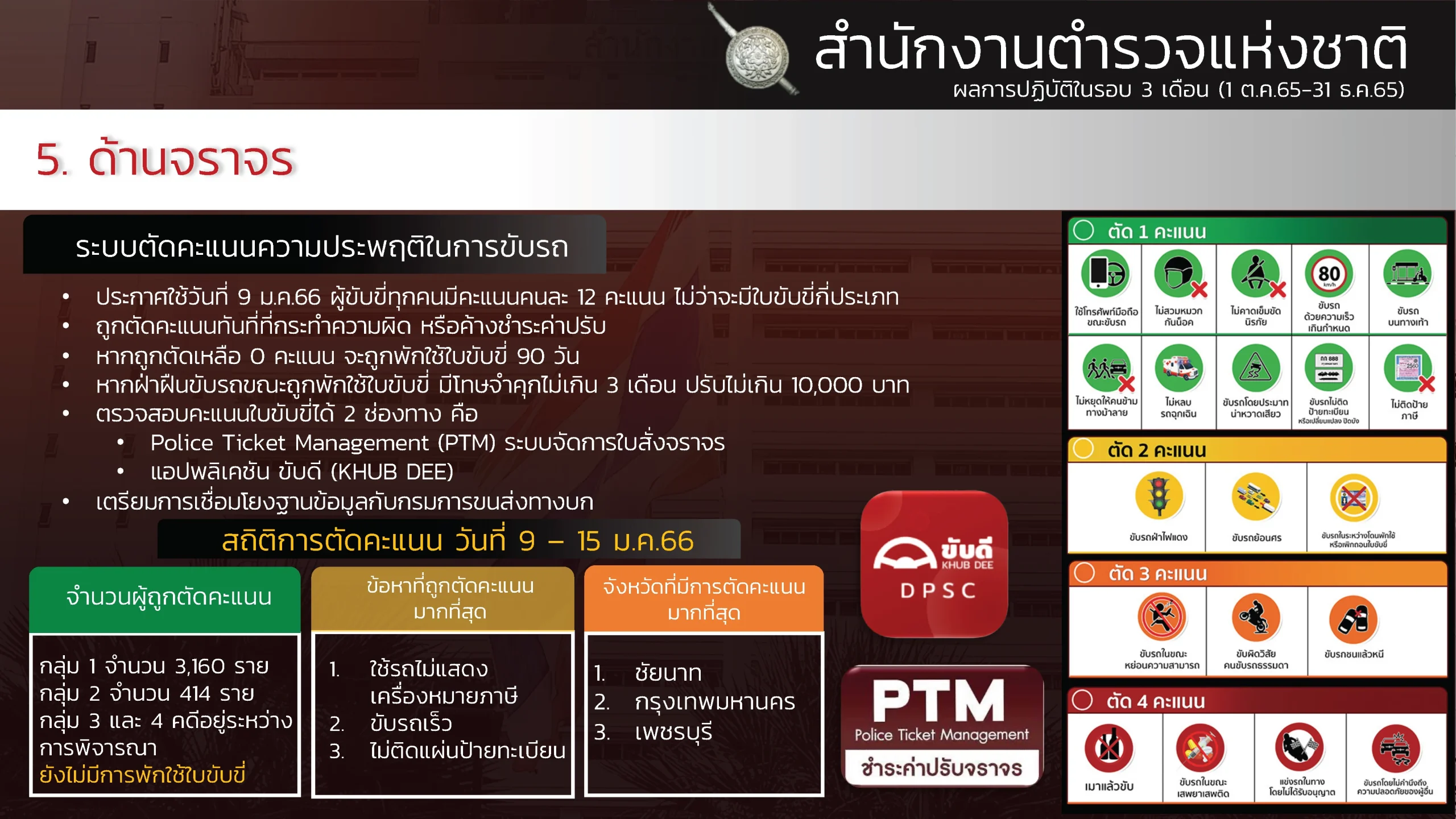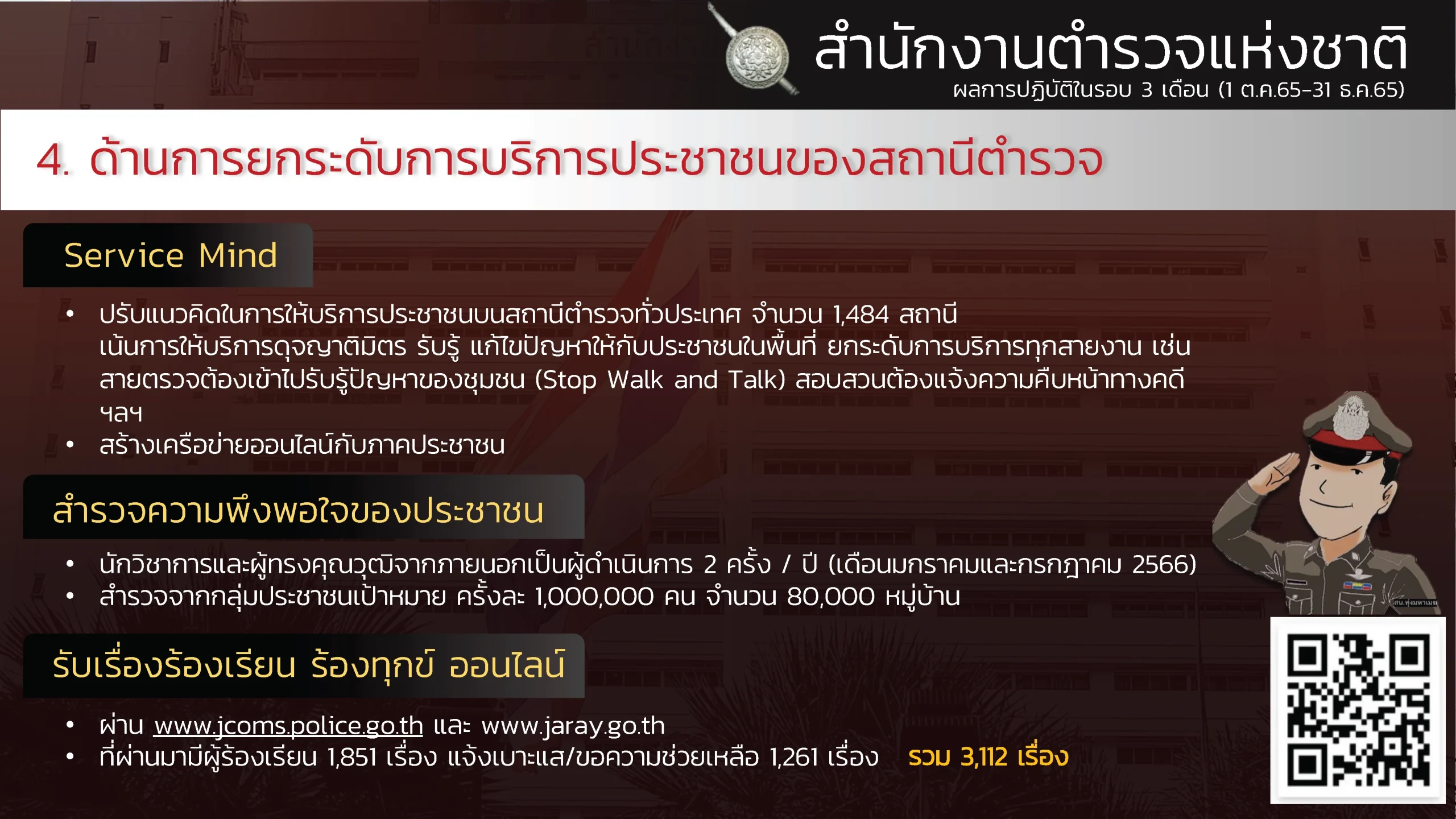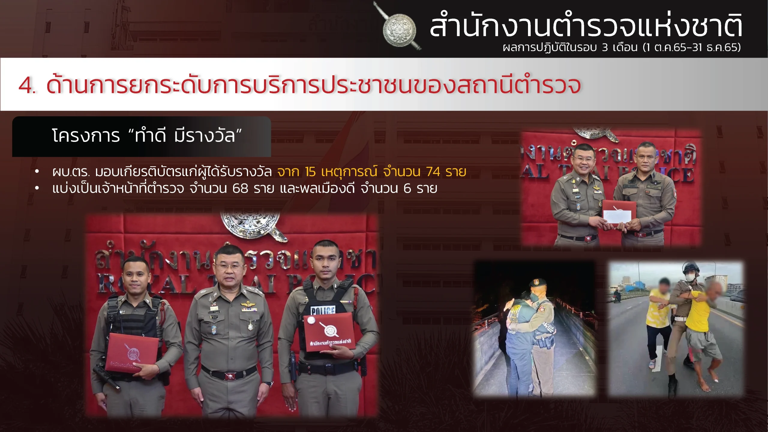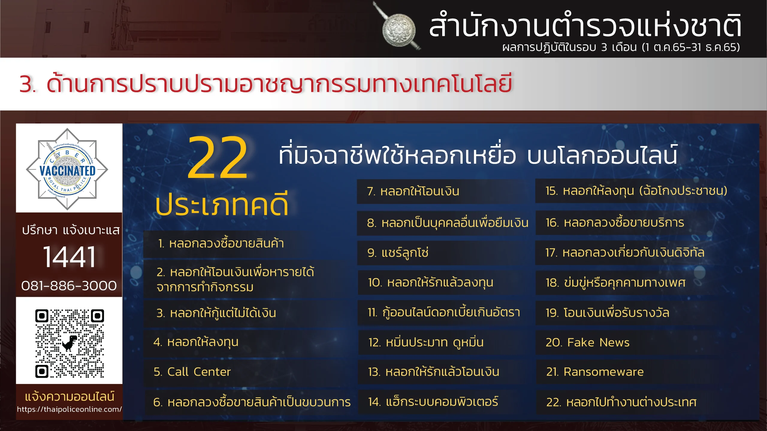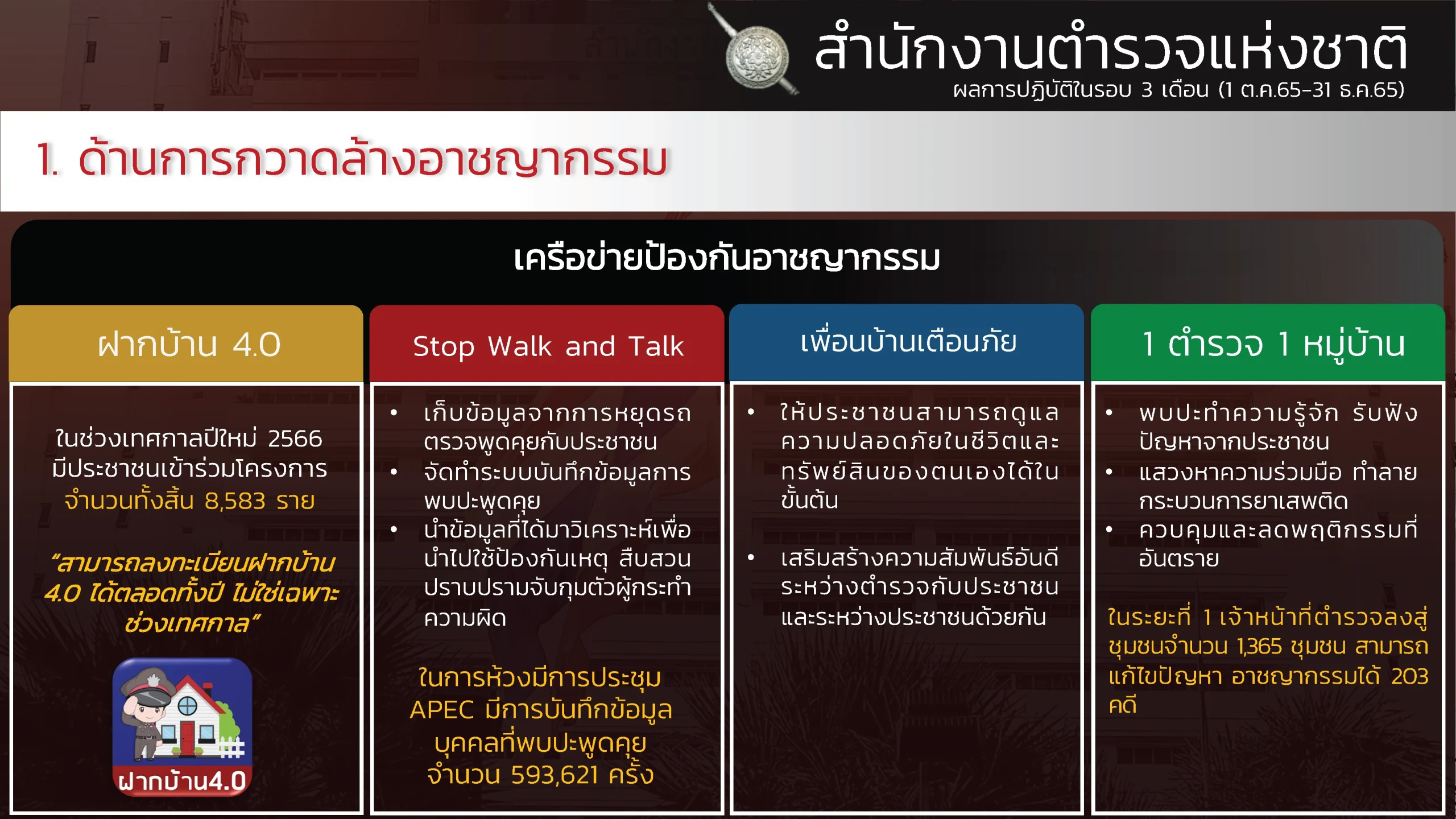 “ผลงานรอบ 3 เดือน ของสำนักงานตำรวจแห่งชาติ (1 ต.ค. – 31 ธ.ค. 65) ” “ขับเคลื่อนนโยบายรัฐบาล กวาดล้างอาชญากรรมอย่างเด็ดขาดและต่อเนื่อง สืบสวนปราบปรามจับกุม คดียาเสพติด คดีออนไลน์ การพนัน อาวุธปืน สถานบริการ เพิ่มความเข้มในการคัดกรองและจัดระเบียบคนต่างด้าวฯ แก้ไขปัญหาและช่วยเหลือประชาชนในพื้นที่”