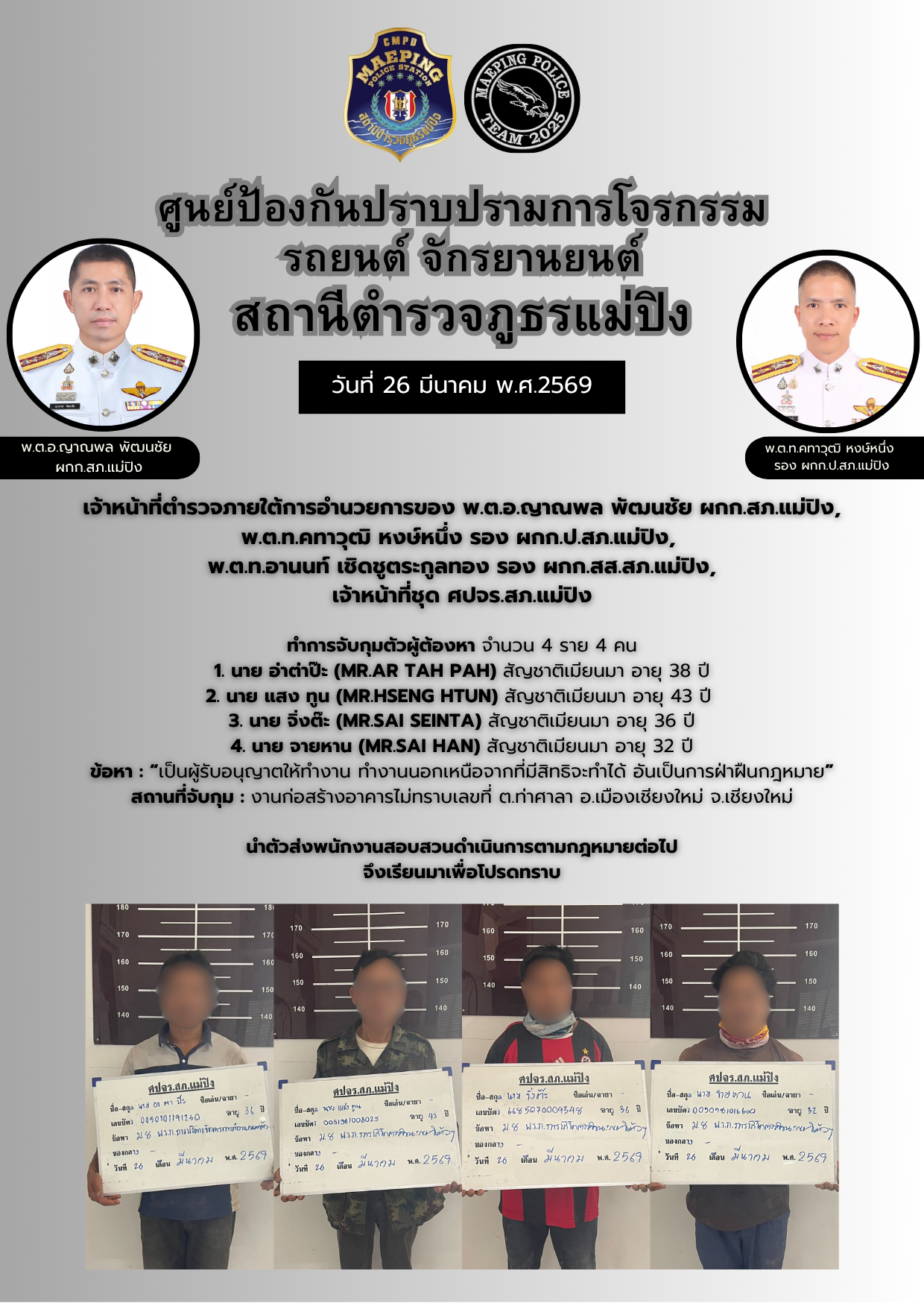 📌 สภ.แม่ปิงนำเรียนผู้บังคับบัญชาวันที่ 26 มีนาคม 2569ขอรายงานผลการปฏิบัติดังนี้ 👮🏻♀️ เจ้าหน้าที่ตำร